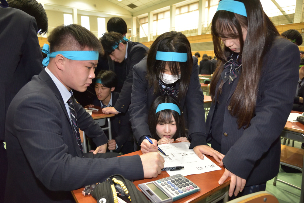 この行事は本校の三大行事の1つで、全校生徒が学年関係なく、商業科目や一般常識等の力を競い合うものです。