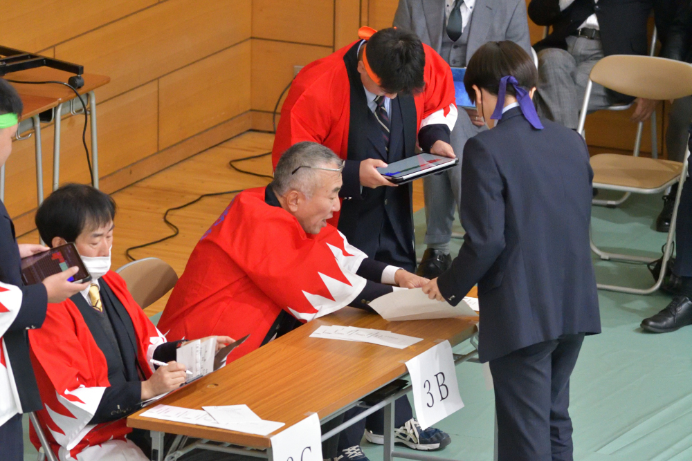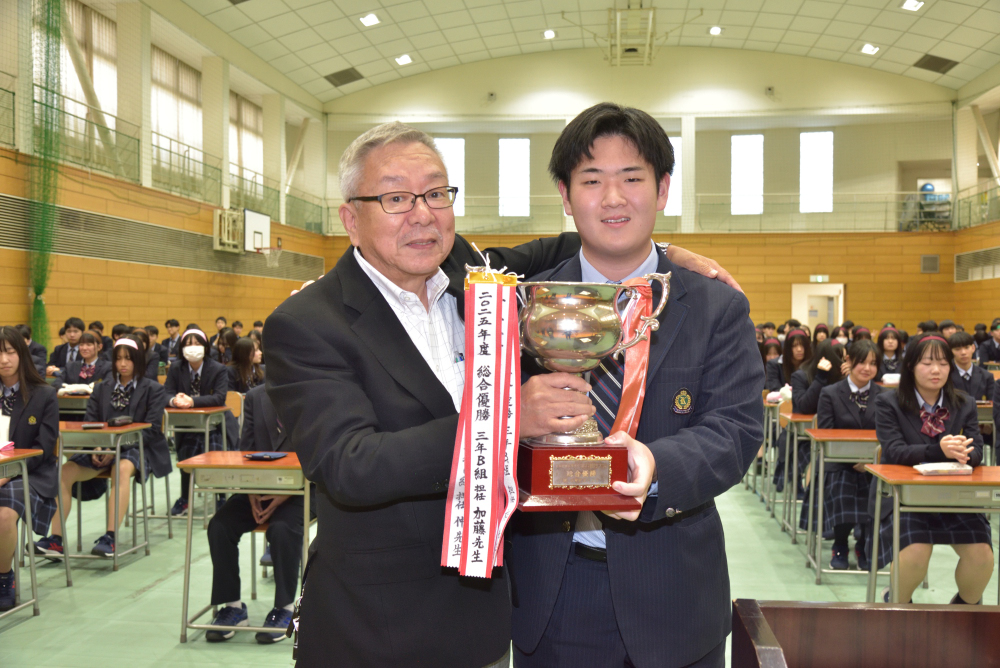 優勝した3年B組には校長から表彰状および同窓会会長より優勝カップが贈られました。
