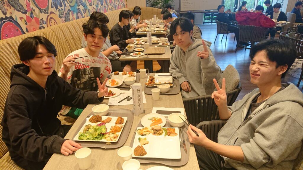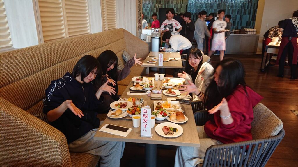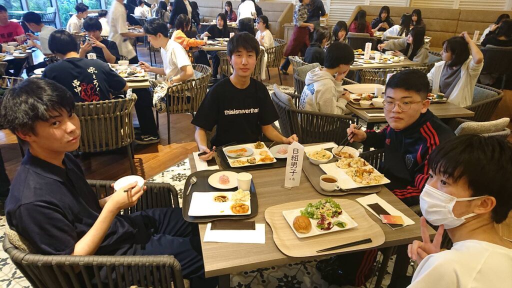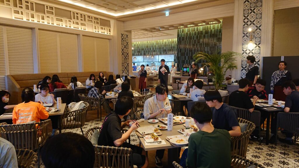 平和祈念公園見学後には初日の宿泊先となる、プリンスホテルぎのわんに向かいました。宿泊先のホテルには本校卒業生の岩田さんが勤務しており、夕食時に過去の思い出や進路の際の苦労などを話してくださいました。